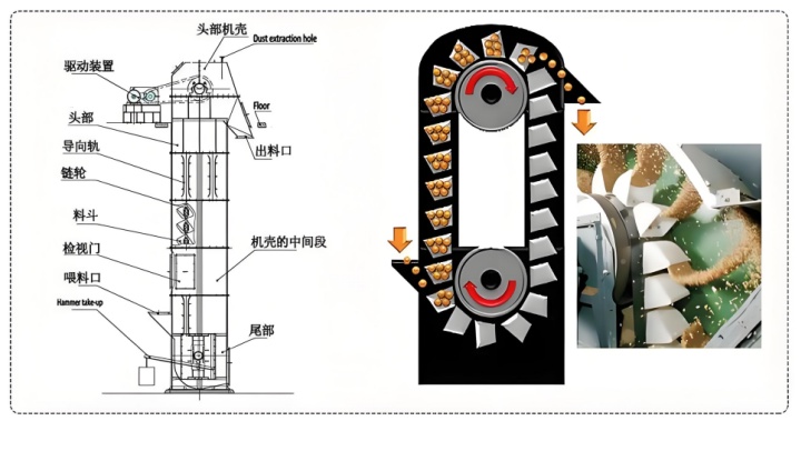 大米板链斗式提升机是大米加工中连接各工序的常用机器,可以实现大米的连续、无破碎、洁净的输送和转运到各个加工阶段。