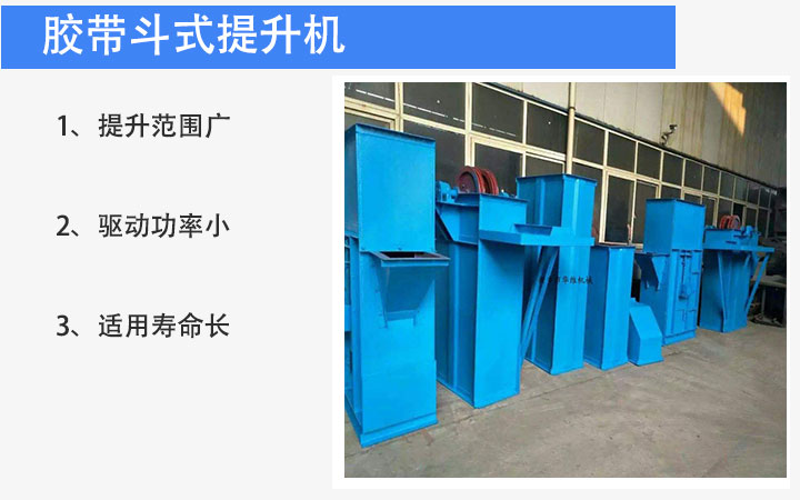 胶带斗式提升机有运动部分,带有传动滚筒的上部区段,带有拉紧滚筒的下部区段,中间机壳,驱动装置,逆止制动装置等组成,适用于向上输送松散的粉状,粒状和小块状的无磨琢性和半磨琢性散状物料的输送。